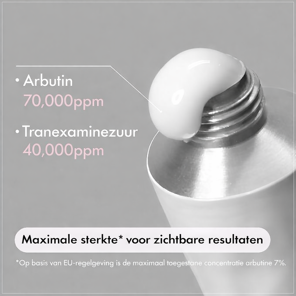 Ingrediënten:Water, Glycerin, Arbutin (7%), Tranexamic Acid (4%), Niacinamide, Butylene Glycol, Caprylic/Capric Triglyceride, Panthenol, Allantoin, Sodium Hyaluronate, 1,2-Hexanediol, Carbomer, Tromethamine, Disodium EDTA.